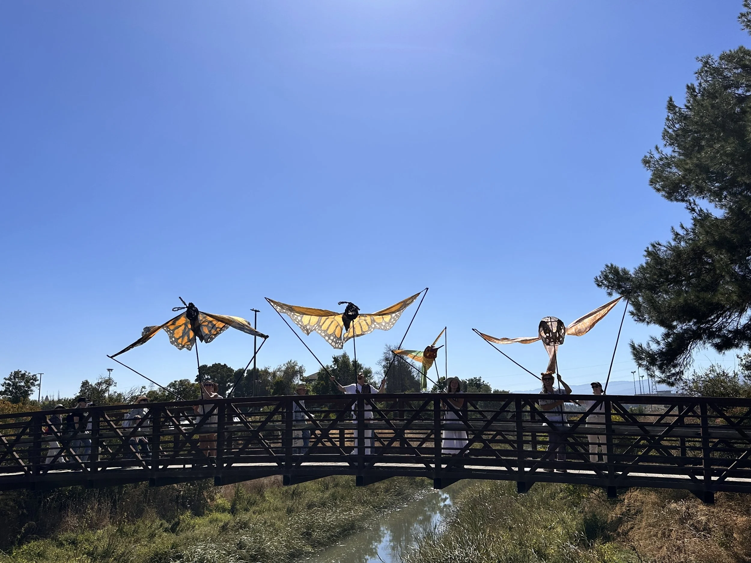 Since moving to Nevada City, my work has taken a distinctly local flight: giant, hand-painted silk bird-kite puppets, butterflies, and dragonflies inspired by the species along the Yuba River—forms that make ecology visible at human scale and invite people into an intimacy with place. If you’ve ever wanted to walk through a forest of silk wings, follow a dragonfly the size of a small car, or join a parade that feels like a spell—that’s the world my medium is built to hold.